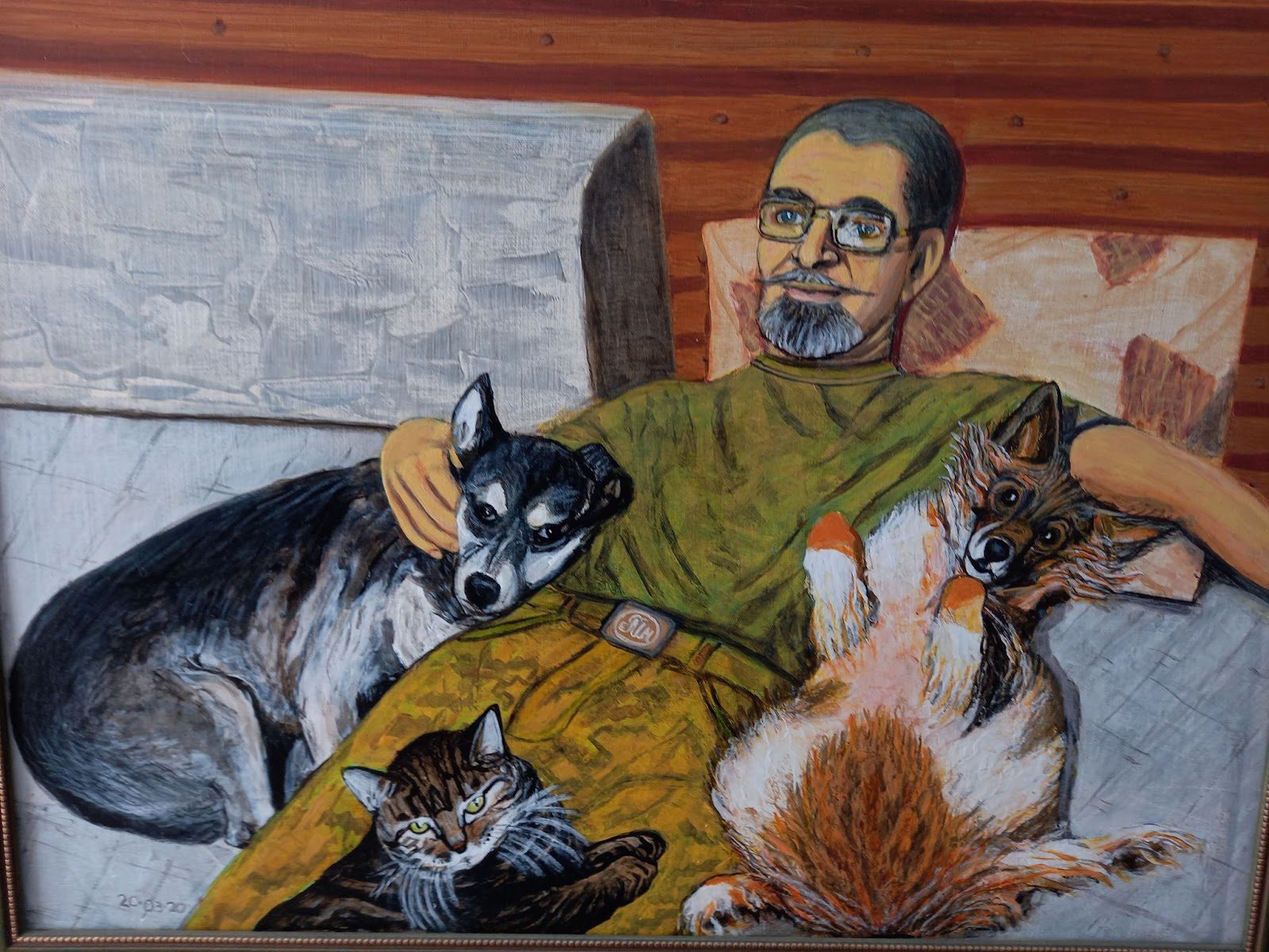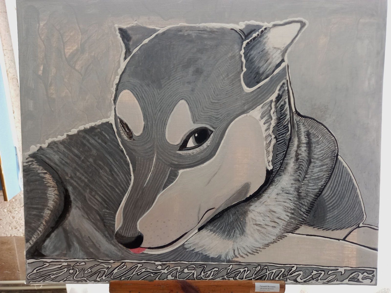 Кстати, художник все-таки присутствовал на выставке – с помощью двух своих картин. На первой, которая называется «Побратимы», Геннадий Молчанов изобразил себя в окружении своих домашних любимцев: двух собак и кота. Отметим, что это единственная картина, выполненная в цвете.