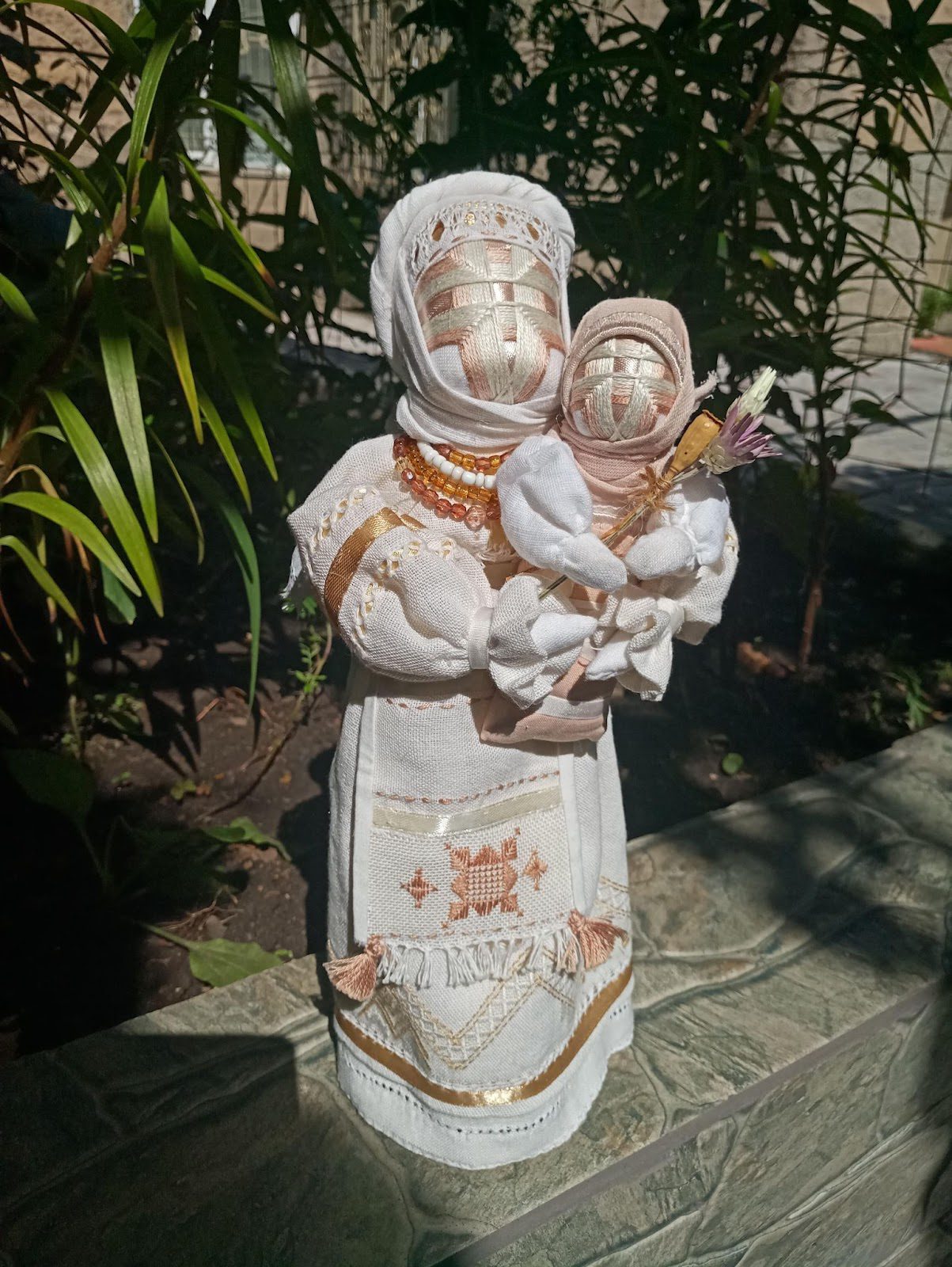 “По-перше, мене щось таке підштовхує. Наприклад був вибух і мені захотілось якось це виразити. Писати я не можу вже. І я вирішила через ляльку це виразити, пов’язати цю ляльку з цим жахом, що вона захисниця, що вона берегиня. Вона ж там з дитиною стоїть. Вона не допустить лиха.