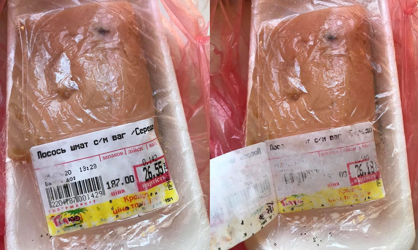 Черговий інцидент стався у супермаркеті “Гіппо” по вулиці Шосейній. Замість якісних продуктів харчування тут городянам підсовують гнилу рибу. Судячи з усього, її  виявилось шкода викидати, тож найкращим виходом стало переклеїти цінник та сподіватись, що покупець не захоче повертатись в магазин та лаятись з персоналом. Продавці переконували, що на вітрині лежить свіженький лосось, але після відкриття упаковки стало все зрозуміло. Риба смерділа так, ніби її життя завершилось ще минулого року. При цьому всі строки були в порядку, але лише до того моменту, коли під основним не проявився попередній цінник. Гнилій рибі продовжили життя на 2 дні. Її запакували ще 13 березня, але потім з’явився цінник, датований вже 15 березня. Чи відповідає дійсності хоч один із них невідомо, адже персонал міг декілька разів змінювати не лише цінники, але і упаковку делікатесу.