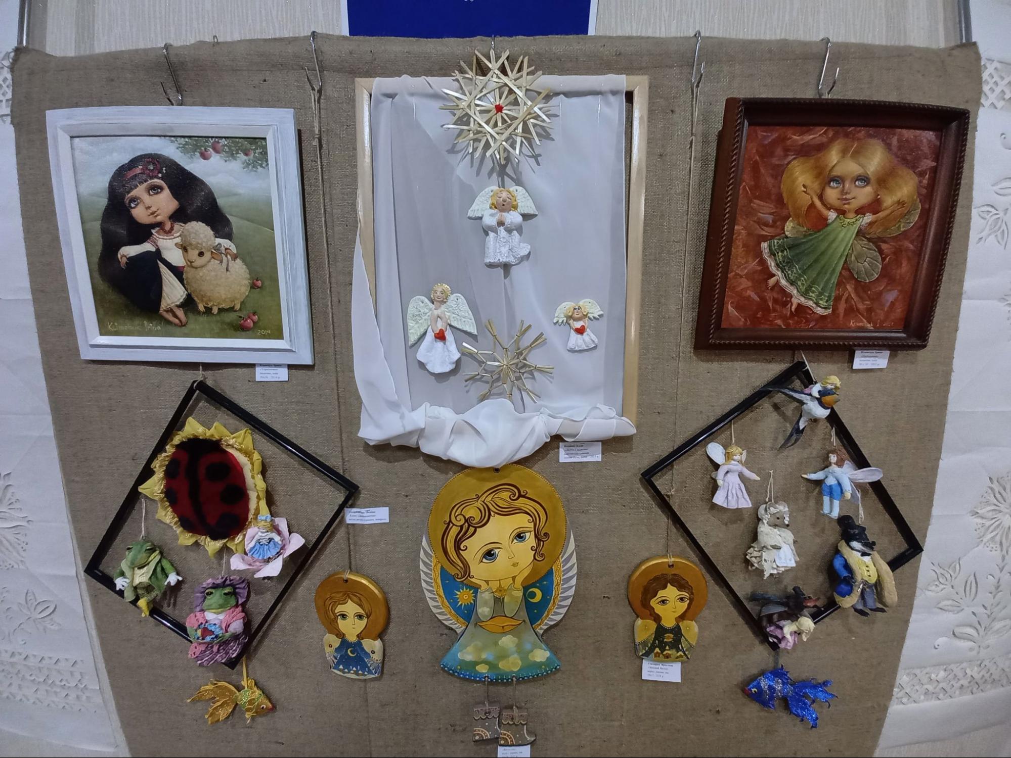 Чимало на стінах солом’яних зірок, а також ангелів з солоного тіста. До речі, янголів на виставці дуже багато. Є навіть, дерев’яні і мереживні. У кутку на столі розташувались обрядові ляльки-мотанки. А на вікнах у якості фіранок виступають величезні витинанки. Справжньою окрасою виставки стали чарівні фентезійні картини Ірини Клімчук.